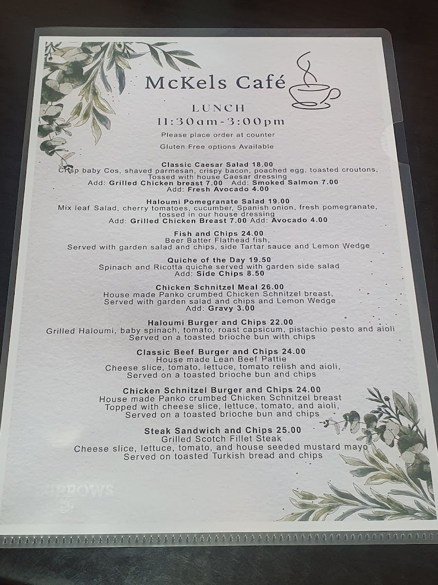- Lunch: Savor the Classic Caesar Salad or the hearty Chicken Schnitzel Meal, both showcasing Cafe Mckels’ commitment to quality and flavor.